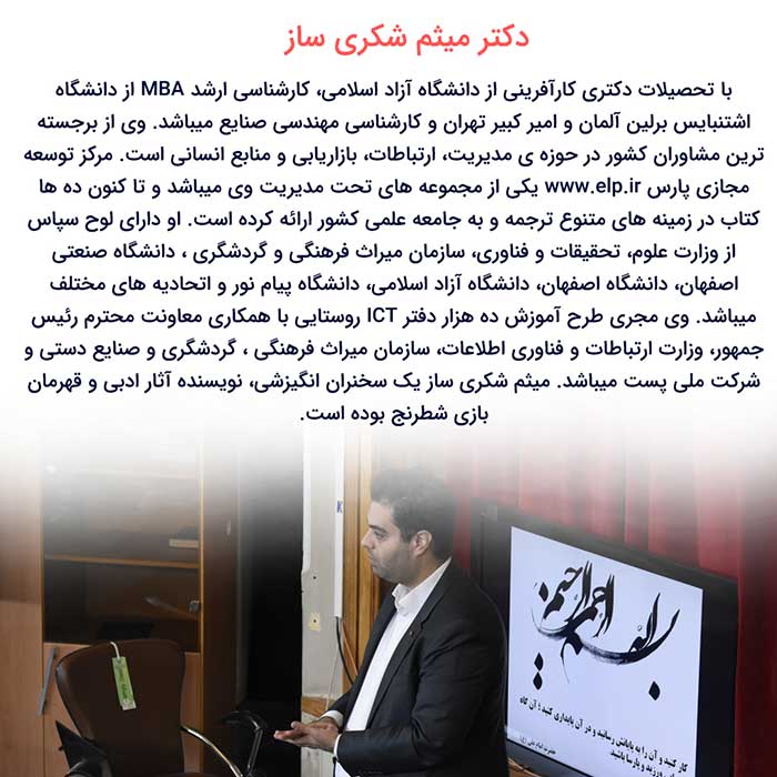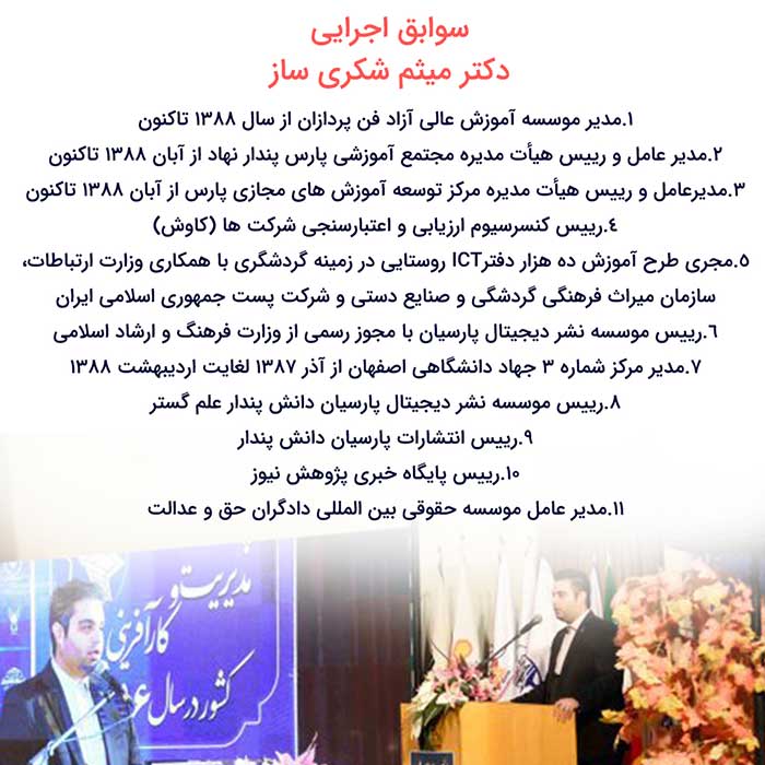 دکتر میثم شکری ساز یکی از مدیران و کارآفرینان برتر کشوری است که سابقه مدیریت چندین مجموعه و شرکت در قالب هولدینگ پارس پندار نهاد را در کارنامه پربار خود دارد. در این صفحه برخی از تصاویر شخصی میثم شکری ساز را مشاهده میکنید.