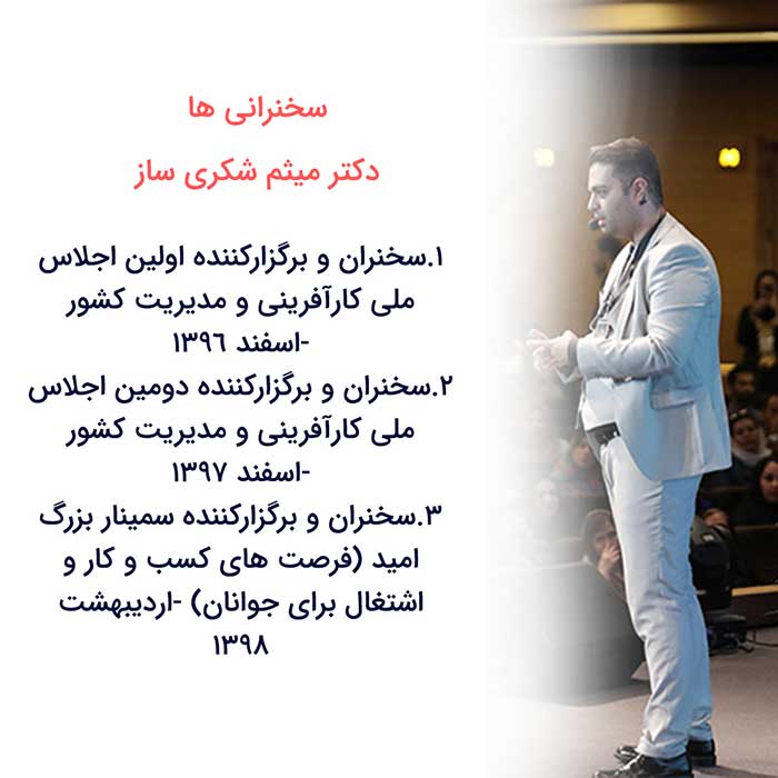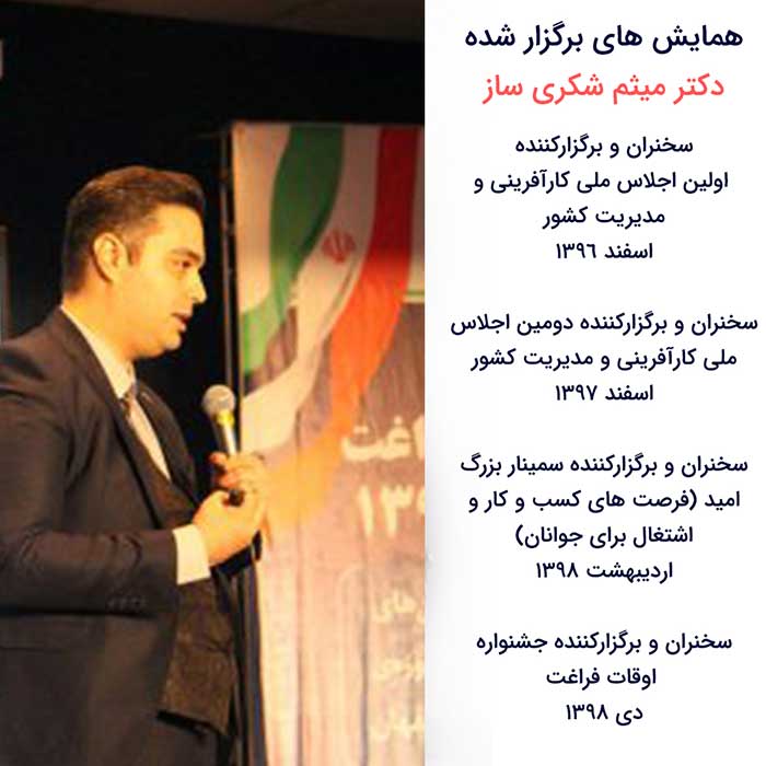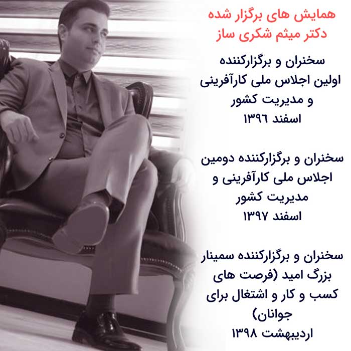 کارآفرینان مختلف در جلسهها و همایشهای گوناگون حضور پیدا میکنند و این حضورشان مایه دلگرمی و الهامبخش است. عکسهای شخصی دکتر میثم شکری ساز هم اینجا قرار گرفته تا علاقهمندان بتوانند آنها را مشاهده کنند.